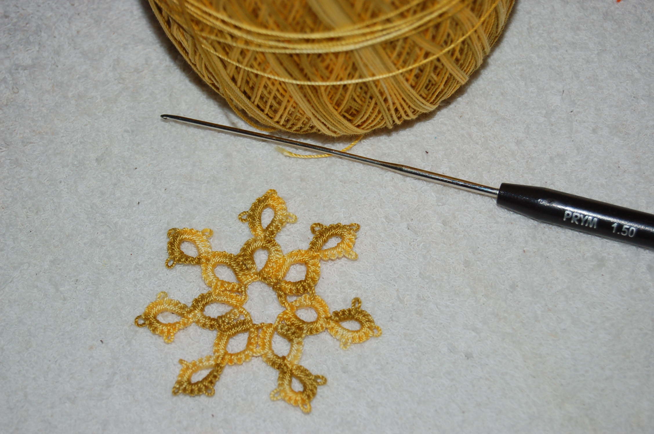 J'ai pu faire beaucoup de petits tests qui n'étaient vraiment pas concluants , voir même, démoralisants , mais avec beaucoup de patience et de courage, la réussite est presque là,voilà un essai qui m'a permis de comprendre que la solution est dans la qualité du fil, et peut être aussi dans la façon de tenir le crochet...(petite précision: pour une gauchère comme moi, il fallait tout inverser, gauche/droite, droite/gauche, grrrr, ça s'emmèle dans la tête avec tous ces noeuds doubles...mais c'est génial!)